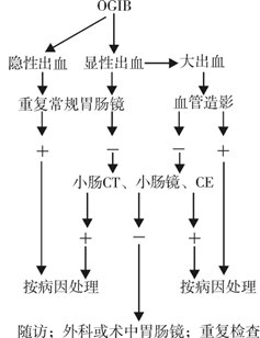1.常规内镜,包括上消化道内镜和结肠镜检查,为OGIB的初步检查。初次检查阴性的患者必要时可重复内镜检查, 有助于提高诊断率及减少漏诊率。