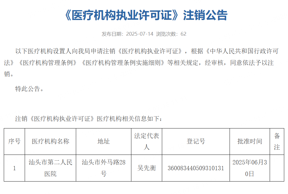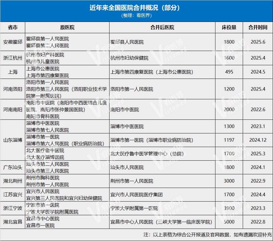 两家“百年老院”合并组建成三甲医院 7月14日,汕头市卫生健康局(中医药局)发布公告,同意汕头市第二人民医院《医疗机构执业许可证》注销。 图源:汕头市卫健局 不过,这并不意味着汕头市第二人民医院不存在了,而是以另一种形式重新亮相。 早在2024年9月,经市委、市政府批准,汕头市第二人民医院与汕头市第三人民医院合并组建汕头市人民医院,并正式运营汕头市公共卫生临床中心。同年10月,汕头市人民医院成立并正式亮相。 据悉,汕头市人民医院定位为“大综合、强专科、应突发、重科研”的三级甲等综合医院。院区占地面积约210亩,总建筑面积29.69万㎡,规划设置1800张床位。 汕头市人民医院开业后,原汕头市第三人民医院全面停业,汕头市人民医院实行一院两区,原汕头市第二人民医院为金平院区,继续为辖区人民提供医疗服务。 汕头市人民医院也由此开启汕头市公共卫生临床中心、金平院区“一院两区”发展新格局。 值得一提的是,这次深度融合的两家医院,均是百年老院,且各具特色,享誉潮汕。 官网信息显示,汕头市第二人民医院前身是英国基督教长老会于1863年创办的汕头福音医院,1953年改名为汕头市第二人民医院,迄今已有160年的历史。医院开设病床650张,编制床位1200张。 而汕头市第三人民医院始于1878年的益世医馆,此前是肩负粤东地区结核病防治工作的三级综合医院。 新一轮整合持续推进 多地公立医院掀起“合并潮” 类似汕头市两家公立医院全面融合的案例近年来并不少见,据了解,就在今年6月,安徽省六安市霍邱县卫健委发布了《组建霍邱县人民医院项目社会稳定风险评估信息公开及意见征求》,根据公告,霍邱县医疗卫生资源将进行大幅优化整合,两家公立医院名称或将成为历史。 公告表示,为深入贯彻落实新时代党的卫生与健康工作方针,进一步深化医药卫生体制改革,全面提升县域医疗服务水平,决定对霍邱县医疗资源进行优化整合,撤销县第一人民医院和县第二人民医院,组建霍邱县人民医院,为正科级公益二类事业单位,实行“统一管理、学科分设”运行模式,不再保留县一院、县二院牌子。 今年4月底,河南省洛阳市第一人民医院与洛阳市第三人民医院也宣布合并整合,重新组建洛阳市第一人民医院。据悉,一院和三院均为三级规模综合性医院,建院也均已百年。合并后的新洛阳市第一人民医院床位将增至1200张。 这两家医院曾于2011年成为洛阳公立医院改革试点医院,由政府办公立医院改为民办非营利性医院,而后又于2018年和2019年先后再次迎来改制,恢复成为公立医院。 在妇幼领域,今年4月,杭州市妇产科医院与杭州市儿童医院宣布合并,成立了杭州市妇幼保健院。 在上海,同样也出现了医院合并的现象。2024年5月,上海市卫健委批复同意上海市第四康复医院与上海公惠医院合并,成为上海市第四康复医院(上海市公惠医院),按三级康复专科医院标准转型建设。10月,静安区人民政府还与上海健康医学院举行了签约共建暨附属上海市第四康复医院(筹)揭牌仪式。 除公立医院外,非公医疗机构也在合并中寻求发展。今年5月,北大医疗集团宣布,北大医疗鲁中医院与北大医疗淄博医院合并,组建北大医疗鲁中医学管理中心(总院),合并后开放床位总数达到了1700张。