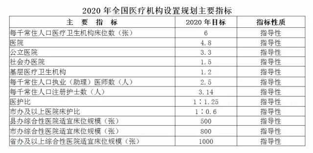 医疗机构的设置以医疗服务需求、医疗服务能力、千人口床位数(千人口中医床位数)、千人口医师数(千人口中医师数)和千人口护士数等主要指标进行宏观调控,具体指标值由各省、自治区、直辖市根据实际情况确定,但不得超过《规划纲要》控制指标。