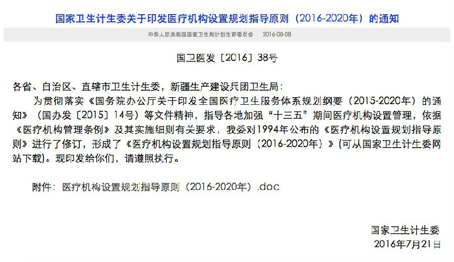 日前,国家卫生计生委发布《医疗机构设置规划指导原则(2016-2020年)》,指导各地加强“十三五”期间医疗机构设置管理。